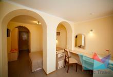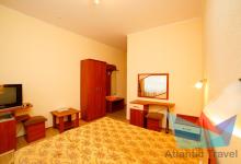 - 2х местный 2х комнатный Юг 26 м2: две односпальные кровати, телевизор, холодильник, кондиционер, телефон. Балкон вид на море. Санузел. Дополнительное место: диван раскладной. Максимальное размещение: 2 осн + 2 доп.место. Питание в ресторане Шелковый путь.
