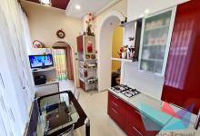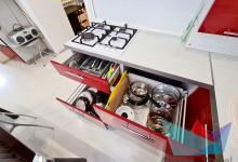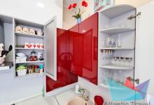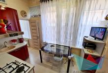 На кухне: кухонная мебель, холодильник, микроволновая печь, газовая плита, вытяжка, духовка, чайник, посуда, телевизор.