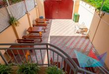 • столики и стулья для отдыха во дворе под навесом