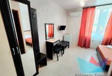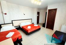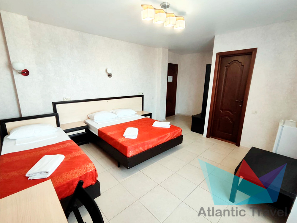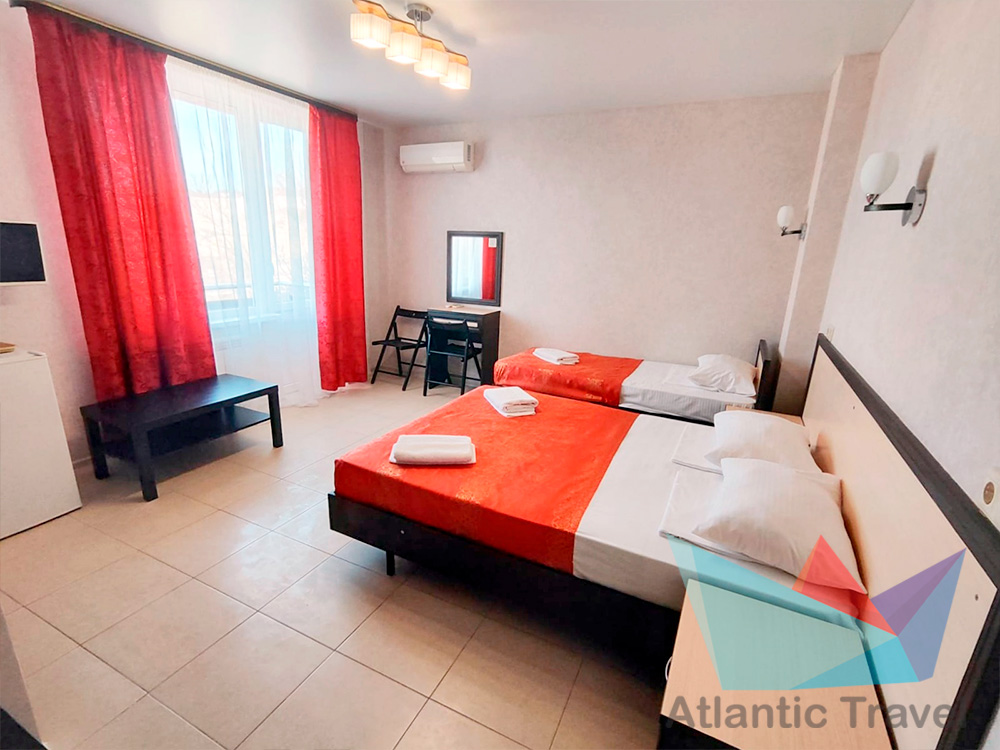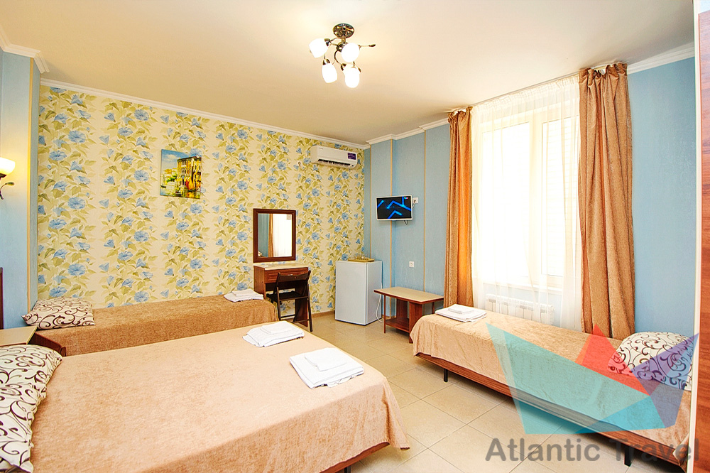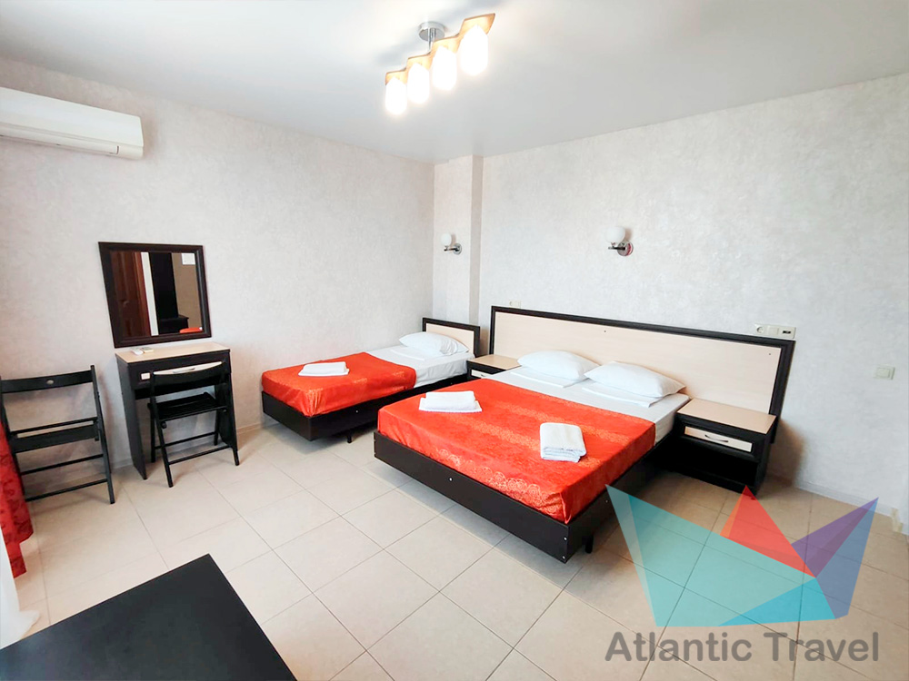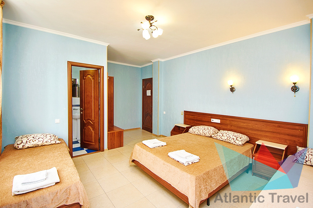 • 3х местный Полулюкс: двухместная и одноместная кровать или три одноместные кровати, тумбочки, журнальный столик, стул, туалетный столик, вешалка, шкаф для одежды, cплит-система, холодильник, кран с водой и раковина, туалет, душ, телевизор. Номер может быть с балконом и без.