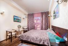 2х местный Стандарт: санузел, двуспальная кровать или две односпальные, шкаф-купе, прикроватные тумбочки, стол, кресло или диван, косметический столик с зеркалом, журнальный столик, стулья, сплит-система, балкон, холодильник, телевизор, Wi-fi, фен, полотенца, средства личной гигиены, сейф, чайник